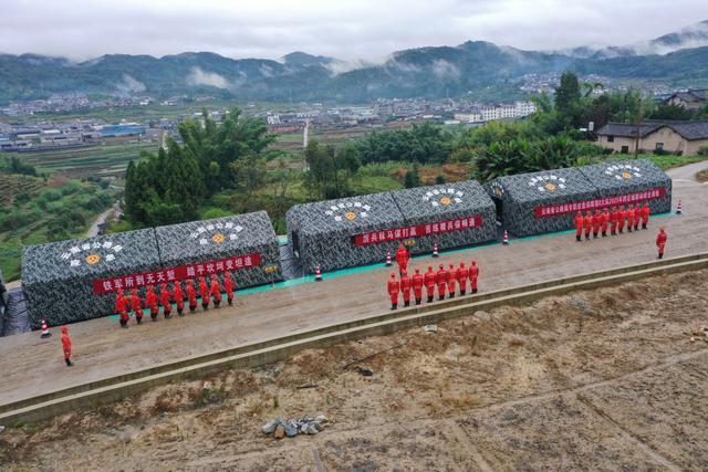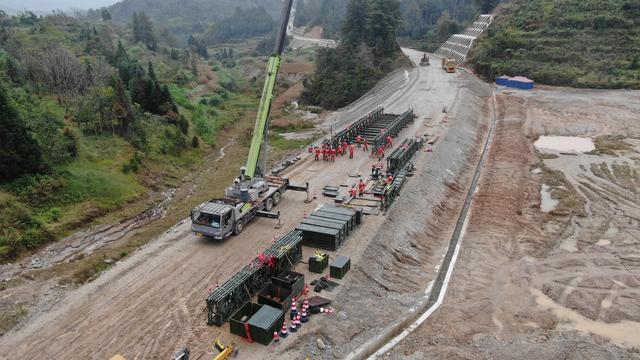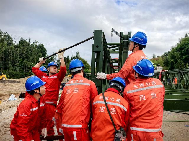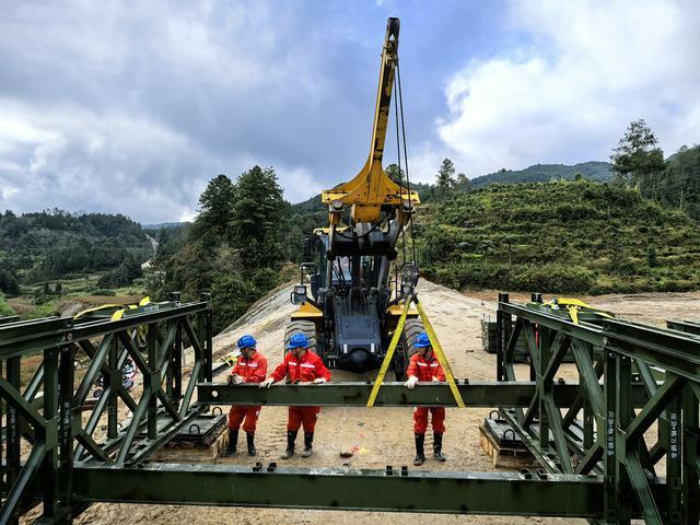 “加油!雨势正急,大家注意安全!一组抬底座,1、2、3起—稳住!连接组抓紧架设横梁夹具!”国道219线龙陵县境内的桥梁架设现场,指令清晰、动作协同,各组队员在风雨中各司其职、有条不紊。